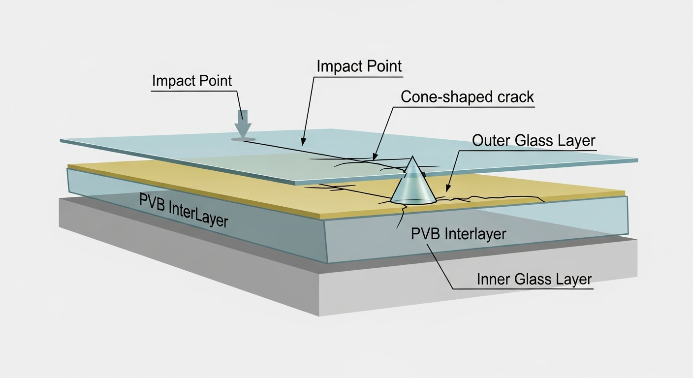 - Depth: The damage has not penetrated through the PVB inner layer to the second layer of glass.